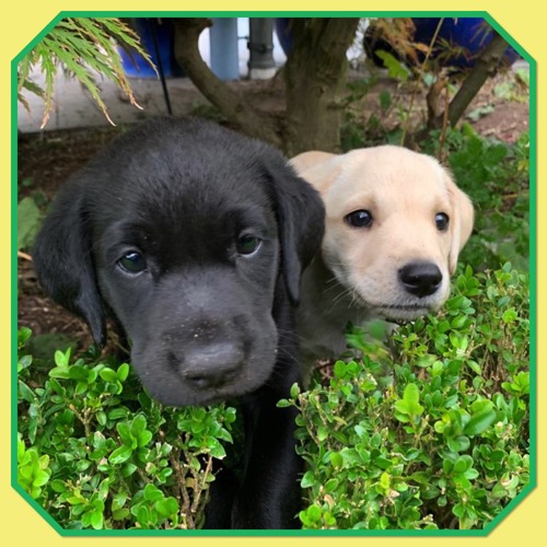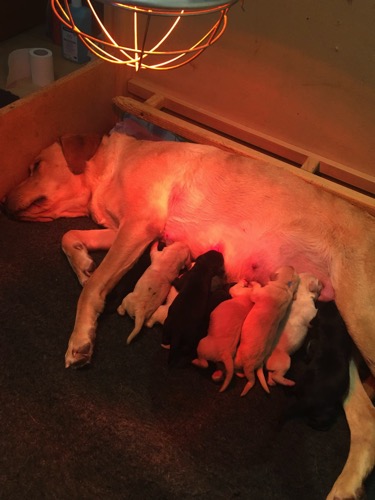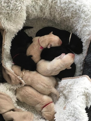 10.08.19 Die Welpen sind da. Zwei schwarze Rüden, zwei gelbe Rüden, zwei schwarze Hündinnen, eine gelbe Hündin.